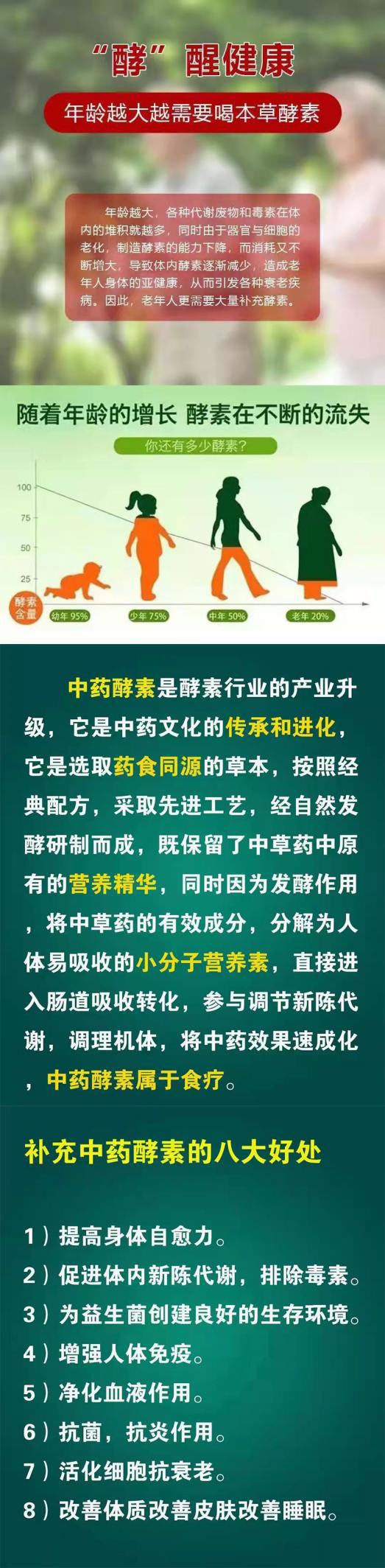 酵素(酶)是一类生物催化剂,它们支配着生物的新陈代谢、营养和能量转换等许多催化过程。权威研究表明体内酵素的多少在一定程度上决定了寿命的长短。我们日常维持体内酵素的充足,才是最好的养生方式。现在喝中药本草酵素的人越来越多了,中药本草酵素是水果酵素的升级,更全面深度调理身体。每个人喝本草酵素的目的也都不一样。本草酵素不同于普通的营养补充剂,它通过调整人体微生态环境,在多方面直接解决由于菌群失调及酶缺乏导致的各种问题,女人、男人、老年人等都可以饮用。本草酵素有何不同?这一技术能带来哪些质的改变吗?传统中医素来高度认可药食本草的养生功效,但仅仅食用药食原材,存在副作用和吸收率低等问题。五丁科研团队经过多年研究,发现通过用益生菌发酵过后的中草药不仅更加安全温和、吸收效率更高,而且本草的健康功效也得到了大幅提升,含有丰富的人体必须的营养物质。研究表明中药本草酵素人体吸收效率可以提高4~28倍。