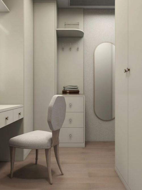 环保材质饰面、珍珠白色的涂装自带高级感,从收纳到展示,再到梳妆台的设计,简约的造型把握着细腻的空间视觉,柔和而不失精致。