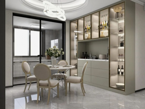 餐边柜除了满足收纳,也起到重要的装饰作用。由上至下的玻璃材质柜门,为空间增加通透性,柜内摆上喜欢的酒、杯子等,尽显生活格调,中间留空设计,便于放置水壶、香氛等小物件,维持台面整洁,营造一个舒适的用餐环境。