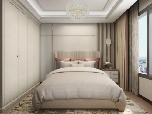主卧通过不同材质和线条的运用增加层次感,整体色调以素雅的浅色系为主让空间面积感觉更大,床头温柔粉靠垫的点缀,营造出浪漫温暖的感觉。