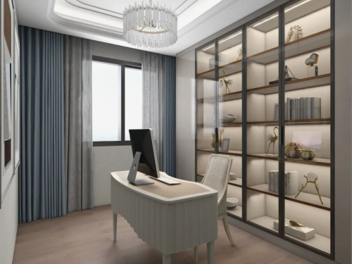 简约线条的浅色系书桌椅,一面及顶的定制书柜,满足书籍和摆件等物品的陈列,蕴藏轻奢美学的玻璃柜门,增加室内通透性,淡蓝色定制窗帘的点缀,静享阅读时光。