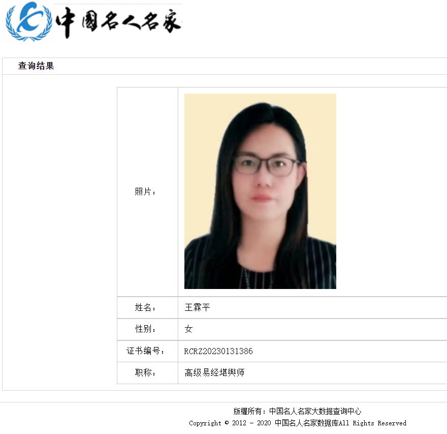 王霖平老师,女,1978年生人,祖籍河北定州人,现居天津。周易文化研究学者,中国优秀传统文化青年学者,中华易学导师协会理事,近日又获得中国国际工业信息化协会人才认证办公室高级易经堪舆师专业技能资格认证证书,并被中国名人名家数据库中心收录。