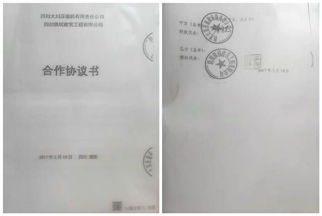 四川大川压缩机有限责任公司与四川铁瑞建筑工程有限公司签订《合作协议书》(首页及末页)
