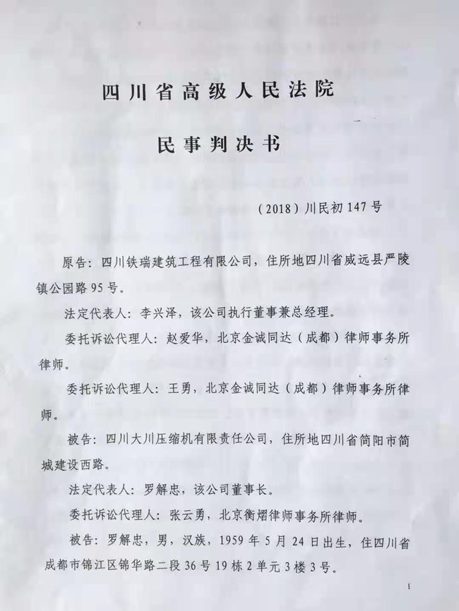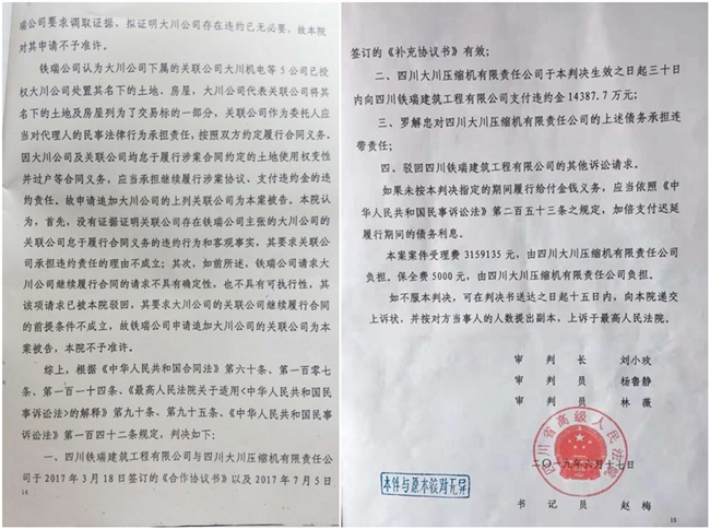 2019年6月17日,四川省高级人民法院(2018)川民初147号《民事判决书》判决:四川铁瑞建筑工程有限公司与四川大川压缩机有限公司于2017年3月18日签订的《合作协议书》以及2017年7月5日签订的《补充协议书》有效;四川大川压缩机有限责任公司于该判决生效起三十日内向四川铁瑞建筑工程有限公司支付违约金14387.7万元。