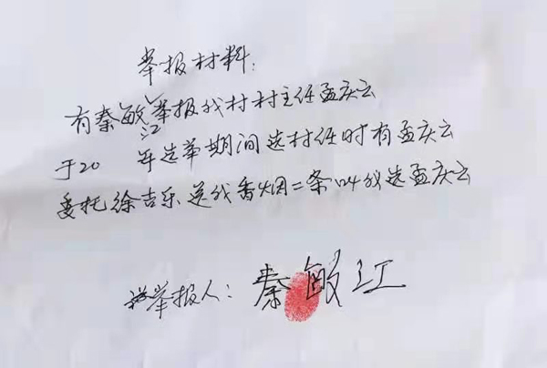 举报群众还反映,2012年孟庆云竞选村主任时,徐吉乐给秦敏江送香烟两条,要求秦敏江为孟庆云投票; 2018年孟庆云竞选村主任时,高义才给王明文送现金人民币300元,要求王明文为孟庆云投票。