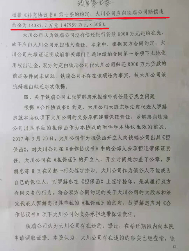 据四川大川压缩机有限责任公司向记者提供的四川省高级人民法院(2018)川民初147号《民事判决书》显示:“根据《补充协议书》第七条约定,大川公司应向铁瑞公司赔偿违约金14387.7万元。”这份《补充协议书》作为支撑此判决的核心证据,从头至尾,加上“其他约定事项”条款仅有三条约定。法官刘小玫所指的第七条纯属无中生有的捏造。