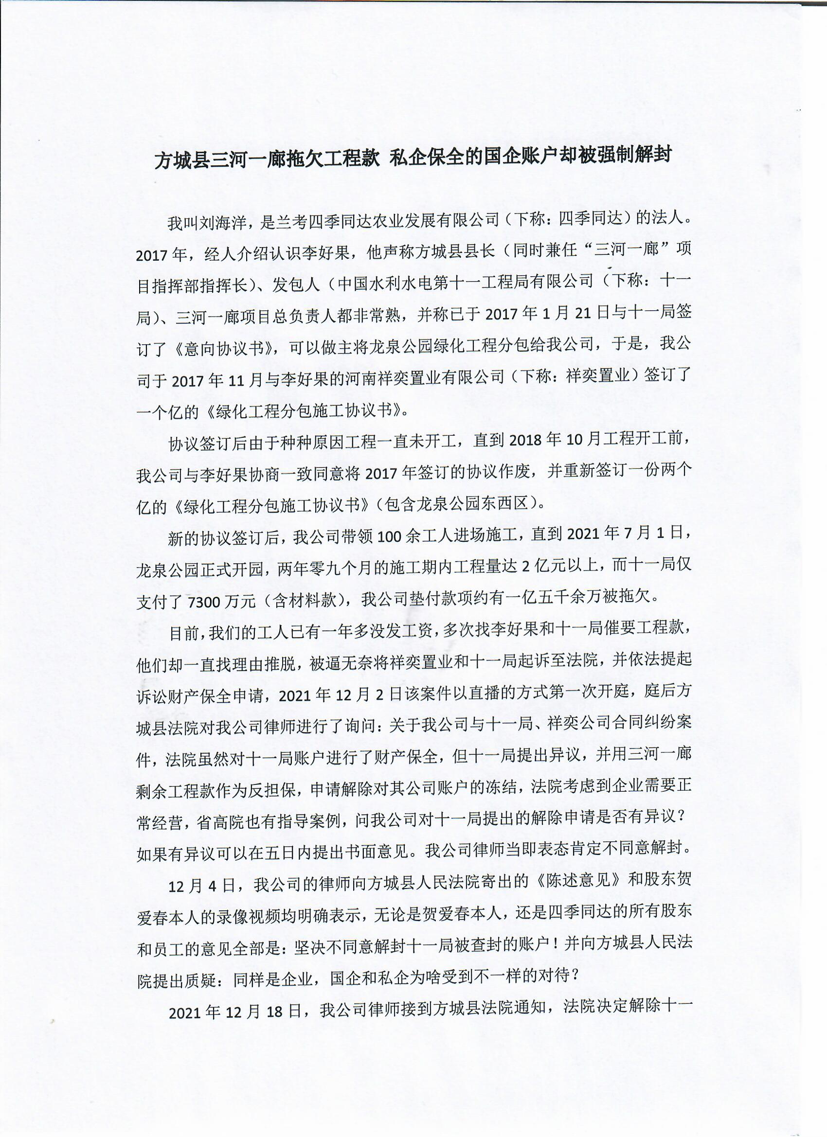 12月4日,我公司的律师向方城县人民法院寄出的《陈述意见》和股东贺爱春本人的录像视频均明确表示,无论是贺爱春本人,还是四季同达的所有股东和员工的意见全部是:坚决不同意解封十一局被查封的账户!并向方城县人民法院提出质疑:同样是企业,国企和私企为啥受到不一样的对待?