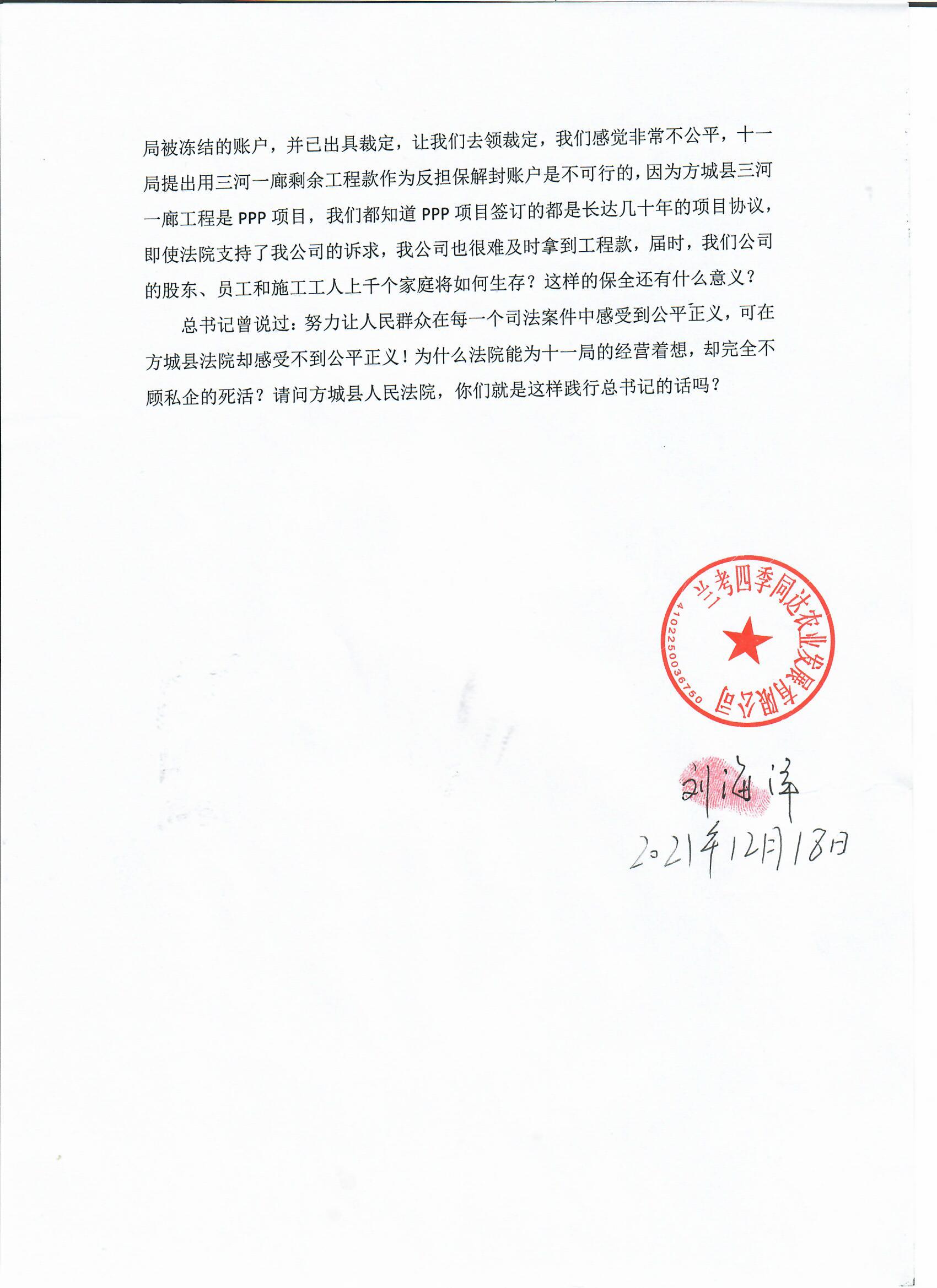 2021年12月18日,我公司律师接到方城县法院通知,法院决定解除十一局被冻结的账户,并已出具裁定,让我们去领裁定,我们感觉非常不公平,十一局提出用三河一廊剩余工程款作为反担保解封账户是不可行的,因为方城县三河一廊工程是PPP项目,我们都知道PPP项目签订的都是长达几十年的项目协议,即使法院支持了我公司的诉求,我公司也很难及时拿到工程款,届时,我们公司的股东、员工和施工工人上千个家庭将如何生存?这样的保全还有什么意义?