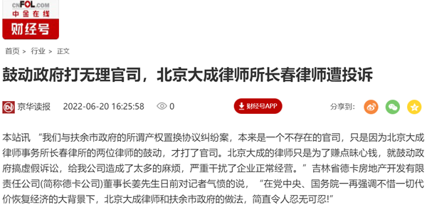 北京大成律师事务所长春律师鼓动政府打无理官司赚昧心钱?