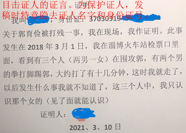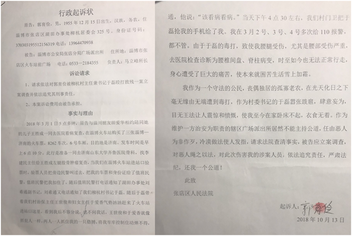 村民郭育俭对记者说:事情发生在2018年3月1日,他与朋友田爱华相约陪同她的儿子王胜成一同去济南看病,当他们在淄博火车站进站检票时,验票人员把他的车票和身份证给了车站值班民警,值班民警电话通知了他们柳行村书记兼主任于磊,于磊及村治保主任王世俊和村妇女主任于爱香,三人开车到达火车站后,不问青红皂白,于磊上前就冲他胸腹拳打脚踢,将其打倒在地,他拿手机准备报110,于磊见状夺走手机后,再次用脚猛踹他的腹部、腰部。在三位村干部的暴打下,他便昏迷了过去。后来听在场的群众说,三位村干部强行把他拖到于磊的车上,当他在车上渐渐苏醒时,于磊又打了他一顿,并将他带到村治保办公室,非法拘禁三个多小时。在这三个多小时里,于磊又毒打他数次,打的累了就走了。他的腰腿部被打伤站不起来了,他爬行到路边的电话亭,求人替他拨打了110,但110却没出警。无奈他坐车去了广场派出所报案,派出所不给记录,也不管,反而给于磊打电话,于磊、王世俊又强行把他连打带骂的带回了湖田街道办大院。于磊、王世俊走后,他向湖田街道办副书记刘其通反映情况,刘其通不耐烦地说了一句:“该看病看病”,就不理他了。他没有钱治病躺在床上也无人管,最终导致终生残疾拄双拐。无故将他打残的三名凶手至今依然逍遥法外无人管。
