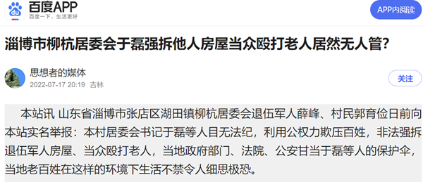 本站讯 山东省淄博市张店区湖田镇柳杭居委会退伍军人薛峰、村民郭育俭日前向本站实名举报:本村居委会书记于磊等人目无法纪,利用公权力欺压百姓,非法强拆退伍军人房屋、当众殴打老人,当地政府部门、法院、公安甘当于磊等人的保护伞,当地老百姓在这样的环境下生活不禁令人细思极恐。