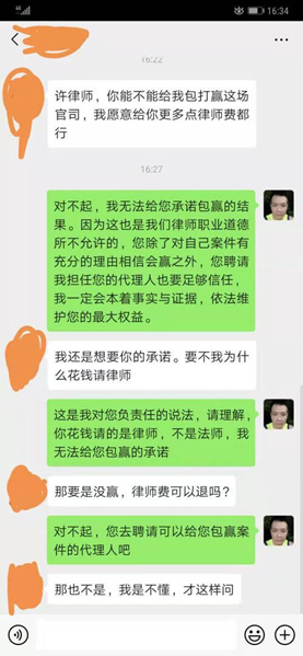 今天,笔者就遇到了这样的一位当事人,她在微信中就一再地要求笔者对其案件作出包赢的承诺,甚至以加律师费为诱惑。您别不信,见下图: