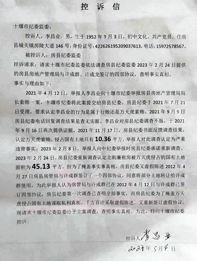 2023年1月8日李昌业向房县纪委申请到北 京中 纪 委 举 报,房县纪 委信 访室主任书面承诺房县纪 委将重新立案调查。