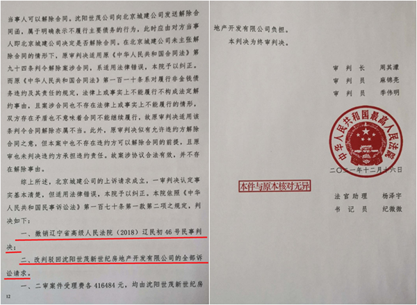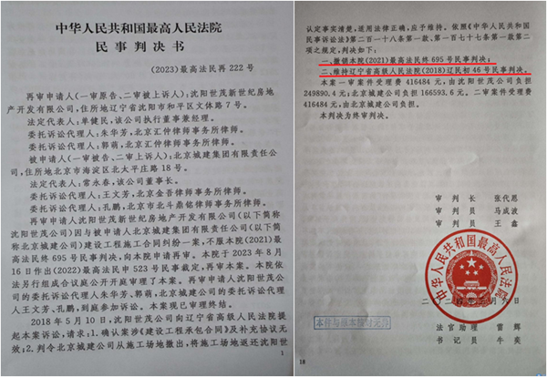 北京城建公司说:到此,该案本应就此划上句号,但沈阳世茂又向最高人民法院审判监督庭提出了申诉。该院审监庭法官张代恩违法裁定再审,悍然作出了(2023)最高法民再222号民事判决书,不顾我国民事诉讼法211条第11款的明确规定,撤销(2021)最高法民终695号民事判决,维持了辽宁省高院(2018)辽民初46号错误判决,把明晃晃的违法写在判决书里,胆大妄为,根本不把党纪国法放在眼里。