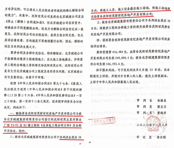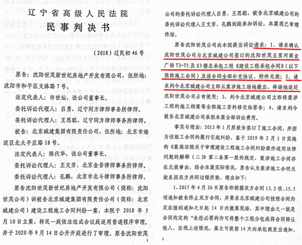 北京城建公司向媒体介绍:2013年1月25日,沈阳世茂公司作为发包方,北京城建作为承包方签订了沈阳世茂五里河商业广场工程施工合同。工程施工过程中,沈阳世茂却一直拖延支付工程款。2015年3月,沈阳世茂又根据工程需要下达了停工指令。沈阳世茂为了赖账和拖延支付工程款,2018年又以确认合同无效为由起诉至辽宁省高院,辽宁省高院认为合同合法有效,沈阳世茂要求确认合同无效不成立。但辽宁省高院法官孙维良在沈阳世茂拖欠巨额工程款、没有当事人诉讼请求作基础的情况下,违背民事诉讼法211条第11款的规定,违法判决解除双方合同,并强令城建公司30日内撤出施工场地。