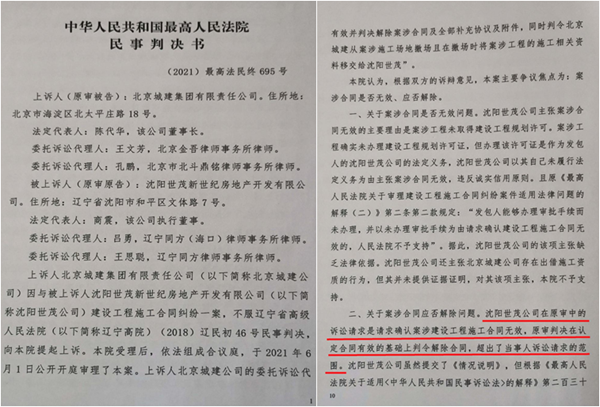 北京城建不服辽宁高院的一审判决,上诉至最高人民法院。最高院二审认为:沈阳世茂公司在原审中的诉讼请求是确认案涉合同无效,原审判决在认定合同有效的基础上判令解除合同,超出了当事人的诉讼请求范围,剥夺了当事人就该问题进行辩论的权利,于是作出(2021)最高法民终695号民事判决书,撤销了辽宁省高院(2018)辽民初46号民事判决书,驳回了沈阳世茂的全部诉讼请求。