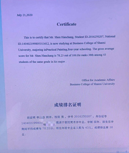 贵院艺术设计学院美术专业总计43个人,申某昌排名第38名,专业分是39名,两项分数都不是最后,况且学校已经公布授予申某昌学位证书了,弄不明白唯独是申某昌不能得到学位证书。