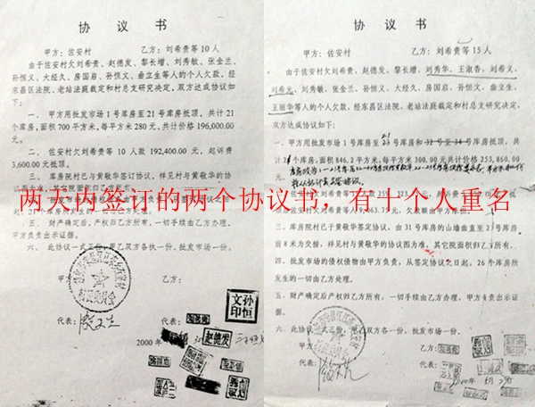 把砖厂变卖之后,孙恒文又于1999年承包了左安批发市场,批发市场承包后,本来是自负盈亏,独立经营,结果他用的人都是由村委会给开支,挣的钱全归他自己。最后,他以两份协议,把批发市场26个库房全归他个人。这两个协议书,第一个协议是2000年5月29号签的,刘希贵等十五人;第二个协议是2000年5月30号签的,刘希贵等10人。这些人都重名。这刘希贵是谁呢?就是孙恒文的老丈人,剩下的也都是他的亲属。还有个“大经久”,是个酒店的名字,也顶人名。说是村委会欠了这些人的钱,用26个库房顶账,26个库房所有一切归乙方所有,乙方是谁?乙方其实就是孙恒文。对此,法院居然还有裁定。就这样,他没用一分钱,就把左安村机砖厂、批发市场归了他孙家所有。