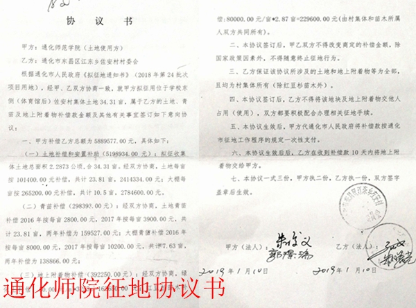 师范学院一共征地33亩,征地补偿一共是589万。师范学院的征收协议是2019年1月10号签的,这个协议是私下里签的,私自签协议的有村书记孙恒文,这个朱曙光是村委会的副主任,村主任是张福义,是法人,他没签字,也没有村委会决议。他俩背着张福义就跟师范学院签了协议,甲方师范学院,乙方村委会,就把这个地私自卖给了师范学院。