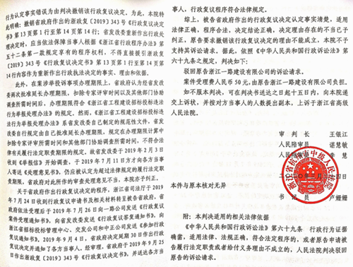 2020年3月20日,杭州市中级法院作出行政判决书认可了省政府行政复议决定书撤销省发改委处理意见的结论,同时在本院认为部分纠正和否定了省发改委认为一路公司业绩无效的认定。