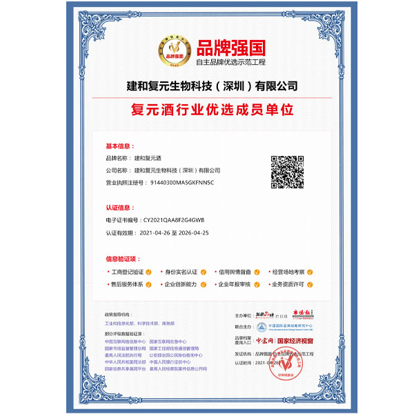 建和复元酒露酒一经上市就荣获了“广东省发展中医药事业基金会推荐产品”,并且经由品牌强国示范工程深圳地区运营中心审核、认证、社会公示,“建和复元酒露酒”符合示范工程评选标准,成功入选为品牌强国示范工程复元酒行业优选成员单位,企业信息录入品牌强国示范工程数据库,在国家级平台展示品牌形象。