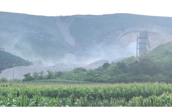远处半山腰的挖掘机还在不停地作业,随着每次的挖掘都会扬起一股灰尘。碎石机器也在轰鸣着,石料在脱离传送带的一刹那也扬起着灰尘。煅烧过程中产生的烟尘缓缓飘起。三股烟尘交织在一起,模糊了原本苍翠的青山本色。