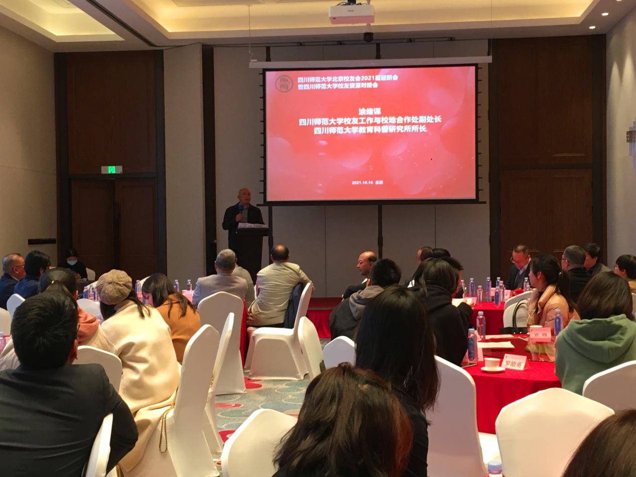 四川师范大学校友工作与校地合作处副处长、四川师范大学教育科普研究所所长涂绪谋专程赴京出席会议。涂绪谋在会议上讲话指出,四川师范大学是四川省属高校排头兵,建校七十五周年以来,遍布海内外的学历教育校友有30多万人,广义校友有70多万人,学校已将校友工作定位为学校战略性工程。四川省四川师范大学校友会是由四川省民政厅正式批准成立的社团组织,并在2021年5月17日正式授牌成立四川师范大学北京校友服务站、四川师范大学北京校友会。他说,北京校友服务站和北京校友分会,是四川师范大学全国校友服务站和校友分会公认的标杆。四川师范大学北京校友会2021届校友迎新会暨校友资源对接会,重点是校友迎新、焦点是资源对接、亮点是导师制度,这是一个良好的开端,展现了校友服务工作的广阔前景,为我们进一步做好校友工作增强了信心。