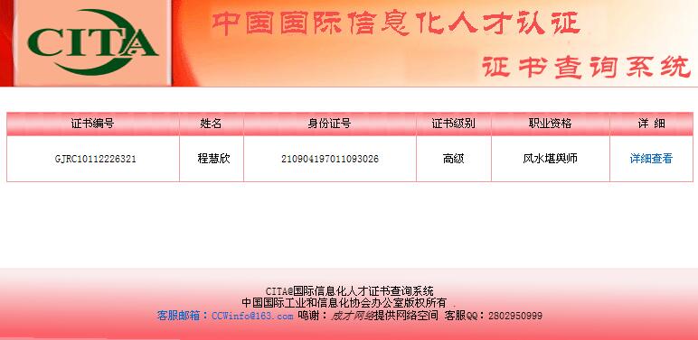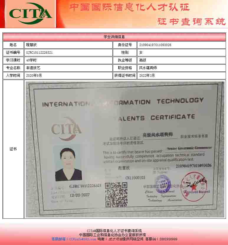 程慧欣,辽宁阜新人。香港乾坤国学院分院院长,北京华夏易缘国学院分院副院长。中国妙派阳宅高级风水师、天星奇门遁甲传承师、中医高级健康管理师、高级心理咨询师、中华周易国学高峰论坛大会主席团执行主席、香港乾坤国学院国学专家。成长于书香门第的她,由佛入道、习儒立身、学以致用,自幼研习佛、道、儒三家经典,对中国古典哲学、周易理论、书法和国画等均有很深造诣。近日她获得中国国际工业信息化协会人才认证办公室高级风水堪舆师专业技能资格认证证书。
