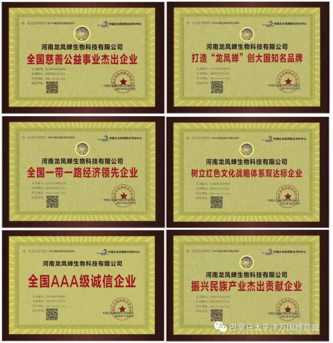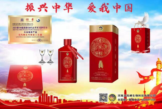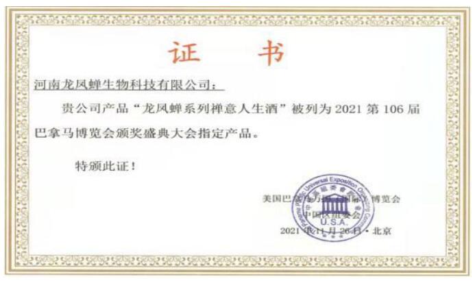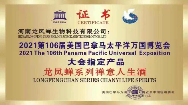 2021年12月2日,2021年第106届美国巴拿马太平洋万国博览会(中国区)在海南海口举行,河南龙凤蝉生物科技有限公司创始人胡永亮受邀参加此次博览会,河南龙凤蝉生物科技有限公司的龙凤蝉—禅意人生酱香白酒,在此次博览会上荣获2021年第106届美国巴拿马太平洋万国博览会大会官方指定用酒,并获得多项荣誉。