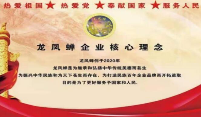龙凤蝉秉承中国神话色彩,做到爱国、忠诚、友善、团结、开拓、奉献,致力于将优秀的龙凤蝉价值理念向社会广泛传播,使我们的各利益相关方感受并认同我们的价值理念。