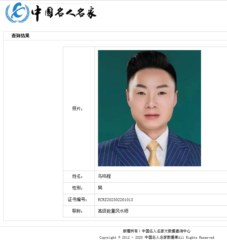 马鸣程,河南省灵宝市人,成长于书香门第之中的他,习儒立身、学以致用,自幼研习佛、道、儒三家经典,对中国古典哲学、周易理论、数字风水等均有很深造诣。先后取得中国管理科学研究院颁发的国学文化高级易经风水传承师证书和中华传统文化高端论坛智库专家等,近日又获得中国国际工业信息化协会人才认证办公室高级风水策划师专业技能资格认证证书,并被中国名人名家数据库中心收录。