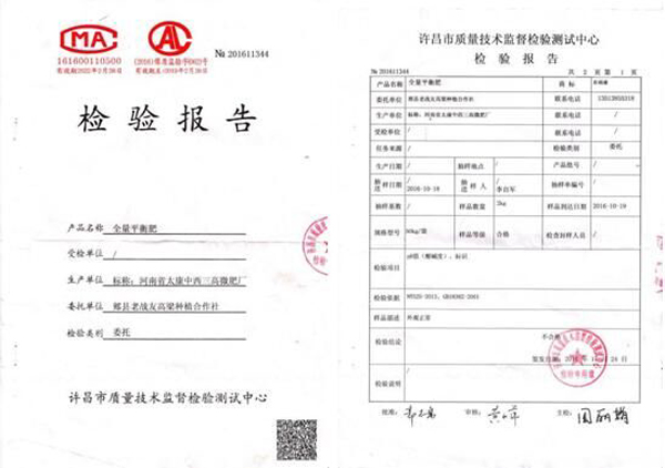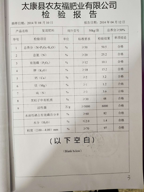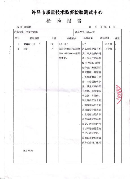 该份《检验报告》明确显示,微肥厂和薛某民向我证明的是其提供的复混肥(与复合肥基本为同一概念)为合格产品。这两份证据已足以证明,我当初向薛某民购买的是复合肥。再说,之前我也根本不知道还有“含微有机肥”和“有机肥料”等什么名词。而“含微有机肥”也只是微肥厂自己起的肥料名称,国家标准并没有这样的名称。