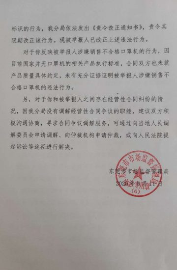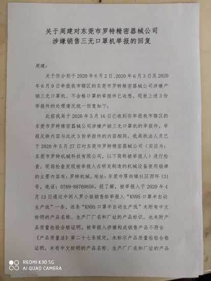 记者离开现场后,将现场了解情况反映给了东莞市厚街市场监管分局,该局一王姓局长称,“我稍后会安排执法人员过去查处,像反映人投诉这种情况属于经济纠纷,至于冒用牌子和有没有生产合格,我们需要安排人员过去查处,生产口罩机也不需要什么资质,据我们了解他们有营业执照,至于出现不合格的口罩机,我们会通知该公司积极与客户协商妥善处理,处理完了我们会给你们回复”。