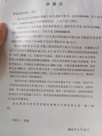 近日,河南省滑县的周先生向本报网反映称:2020年4月12日在东莞市罗特精密机械公司花费45万元购买了台Kn95半自动口罩机,因为口罩机质量不过关,属于三无产品,至今也未能生产出一片成品,经厂家多次沟通,现在厂家电话不接短信不回,买回来的口罩机无法正常生产,原先安排的三十多名工人也都停工了,家里还有一百多万的原材料,周先生对此心急如焚。