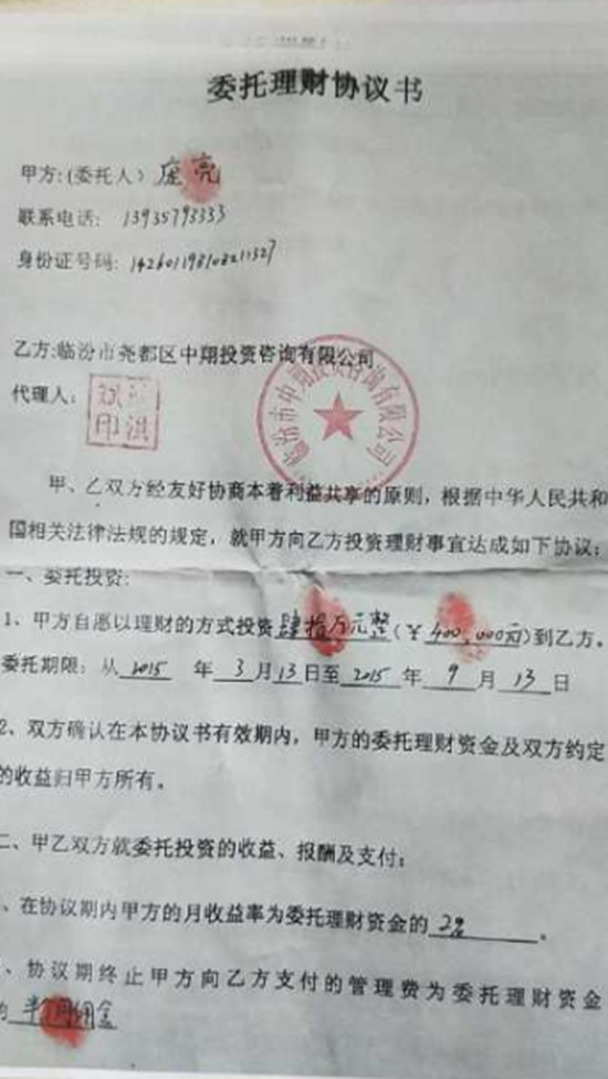 我们于2013年经朋友介绍,得知中德农牧公司需要资金周转,用于集资的中翔投资公司是中德农牧公司的子公司,资金全部用于中德农牧周转,老板名叫王中,当时告诉我们投资公司不开在街面就是为了通过理财公司形式照顾亲朋好友增加收入同时可以解决他公司的资金周转问题,所签合同中体现理财资金的利息为2%(一年支付11个月利息,剩余一个月为投资公司管理费),该投资公司设立在南机场某小区最深处的一座二层小楼。经过我和妻子的实地考察,中德农牧确实是实体企业,在临汾尧都区首屈一指,我们陆续给中德农牧放款55万元整,签署合同对象为中翔投资公司,并附有财务公章,合同为每半年到期后可以再续的形式签订,每当合同到期后继续接下来的合同时,该投资公司都会收回上一期签过的合同,并且打款账户和利息打款每次都是出纳王兵的个人账户,王兵是王中的亲姐姐,在该公司担任出纳工作,出于盲目信任且自我保护意识较差,当初并未追究该账户为何使用私人而不用公户的问题,放款一年半左右,2015年6月合同即将到期时,由于我们的生意需要资金周转,找到中翔投资公司出纳王兵,准备办理合同解除手续,却遭到各种推诿,迟迟无法正常办理,同年7月开始利息也已经不再入账。随即打电话联系接待客户的负责人遆红斌了解相关情况,被告知“因为各大投资公司都出现崩盘现象,社会大环境不好导致人心焦虑,并安抚我们不要担心,资金不会任何出问题。”同时我们听说了一个惊人的消息,该投资公司在经营期间已经换过几次法人了,总觉得心里打鼓,有些不对劲,几经周折,我们找到了中德农牧公司法人王中,他信誓旦旦说我们的资金绝对不会不还,公司绝对承认这笔钱,说他的公司既有固定收入又有国家贷款扶持,让我们放一百个心不会不认账,他正在办理亚投行的贷款,很快资金就要到位,一到位立马还清所有欠款,需要我们继续缓一缓,等一等。