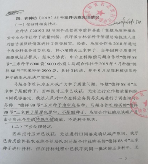 2、该文件称“执法人员对中农金科业务员苏庆焱进行调查……”不是事实。经合作社对苏庆焱、韩小靖核实,其二人否认有相关执法人员对其进行过调查,也没有说过“德祥88号为审定品种,马超合作社购买的德祥88号玉米种子是原包原审,不是假种子”。另外,苏、韩二人作为北京中农的业务人员即使有过该说法,也不具有权威性,不能作为省厅正式文件,特别是不能作为上报国家的文件的事实依据。