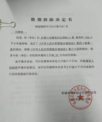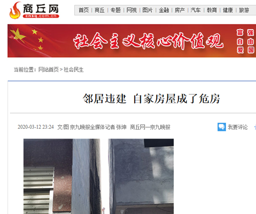 “由于邻居违建,导致我家500多平方米的房子成了C级危房,家人不敢居住。3月12日,商丘网以《邻居违建 自家房屋成了危房》为题,就此事进行了公开报道,但事情至今没有解决。”家住河南省柘城县城关镇新建北街大华四巷的周兰致函有关部门反映说。 我叫周兰,女,1972年4月出生,汉族,住河南省柘城县城关镇新建北街大华四巷。因柘城县城乡综合行政执法局故意包庇纵容违建致我家房屋成为危房,造成我无家可归。 我信访后,柘城县城乡综合行政执法局不得不于2019年10月12日作出柘综限拆字(2019)第0061号限期拆除决定书,该限期拆除时间早已超期,但至今仍未拆除。 在此期间,我一直找执法局,至今无果。当时以白某夫妇之名违建时我就一直给执法局反映,可他们不闻不问,不阻止。直到现在,拆除文件等同废纸。让人感到不可理解。 以白某夫妇之名的违建,疑与其妻哥田某某、田某等人合伙一起建成违建,导致难以执行的根源!违建房屋地基紧挨我家地基挖深两米,又故意放水,使我家地基下沉,房屋倾斜,大梁下垂危险。我一边强烈阻止违建并一直反映求救黄山社区居委会、城关镇、城乡综合行政执法局、110等各相关部门均无果,只能看着给我房屋毁坏,还一直没停止违建,最终还能使违建完成,让我无家可归! 在全面推进依法治国、依法行政的今天,竟然还有不顾党和政府的公信力、不顾形象,等于明目张胆的支持纵容违法者,给我造成很大的损失及危害,精神打击很大,浪费人力、财力、物力。无奈,我只有致函上级有关部门反映情况,望帮帮我,能在上级领导的关注和帮助下得到解决,还百姓一个公道。 新闻链接: 邻居违建 自家房屋成了危房 3月11日,柘城县读者周女士向记者反映,由于邻居违建,导致自家500多平方米的房子成了C级危房,家人不敢居住。虽然向多个部门反映此事,但事情至今没有解决。 11日上午,记者赶到柘城县城关镇黄山社区21巷看到,周女士家的四层房屋墙壁上有多处裂缝,由于大梁下沉,大梁下的玻璃门窗也被压弯。紧挨周女士家西侧,一栋6层楼房主体已经建成,但墙壁上写有“拆”字(如图)。 周女士说,她的房子于2014年建成。2018年,邻居白某在西侧建房,然而在建房过程中,她的房子出现了问题。周女士提供的《司法鉴定意见书》显示,该房屋局部铝合金门窗变形严重,部分纵墙交接处挠曲鼓闪构件为危险构件;检测的承重墙裂缝构件为危险构件……判定该房屋的安全等级为C级。 该司法文书明确指出,白某的房屋基础挖深比周女士的房屋基础挖深要深,且两房基础相挨造成周女士的房屋险情与白某的房屋施工有直接关系。 出现这种情况后,周女士向柘城县城乡综合行政执法局等多个部门反映此事。2019年10月,该局向白某下达了《行政处罚事先告知书》,该告知书以白某未取得建设工程规划许可证为由,判定白某的工程违法,限期30日内进行拆除。 “直到现在房屋也没有拆除,也没有跟我们协商好。”周女士说。 昨天,柘城县城乡综合行政执法局法制股负责人表示,关于此事,白某愿意跟周女士协商,但双方一直没协商好。该局向白某下达了限期拆除的通知书,但白某有申诉和提起行政诉讼的权利,该权利的行使期限为6个月,目前还未到期。到期后,如果白某放弃权利,该局将报请县政府,申请对白某房屋进行强制拆除。他们也愿意帮助双方进行协商。 本报将继续关注此事进展。 (文/图 京九晚报全媒体记者 张坤) 来源:商丘网—京九晚报 原文链接:http://www.sqrb.com.cn/news/2020-03/12/content_2678459.htm