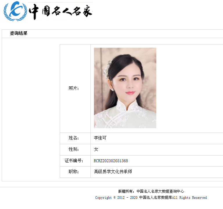 李佳可老师,中国奇门觉学第一人,三合大易学院创办人,奇门遁甲应用专家,《问道终南山研学》总策划师,终南山道文化研究学者,中国管理科学研究院国学文化传承师,中国优秀传统文化青年学者,中国名人名家易学文化青年导师,国际信息化人才认证高级易学文化传承师,中国心理教练生命文化研究学者,被誉为“绝学西施”“现代女诸葛”等,近日又获得中国国际工业信息化协会人才认证办公室高级易学文化传承师专业技能资格认证证书,并被中国名人名家数据库中心收录。