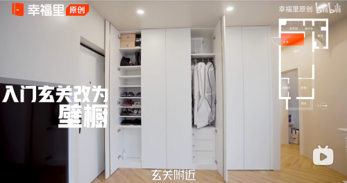 原来的房子进门处有一个玄关的设计,但加美美认为,玄关的存在分走了本就不大的客厅面积,且用处还很单一。于是她拆掉了玄关的隔断,改做了一整面墙的壁橱,既可以存放更多的东西,空间上又和客厅打通更显开阔。