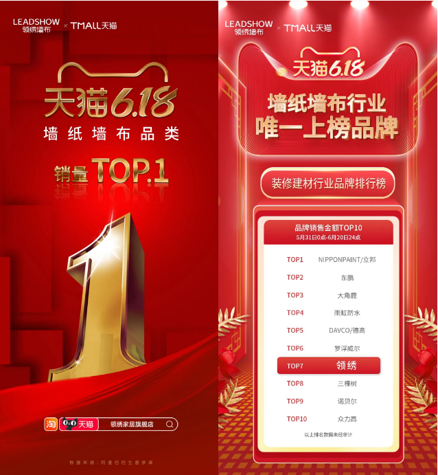 在刚刚过去的6月,领绣618“上市感恩钜惠,金喜大回馈”历时32天最终完美收官,并荣获“天猫618墙纸墙布品类销量TOP.1”,是墙纸墙布行业唯一登上“天猫家装家居618全周期装修建材行业榜”的强实力品牌。这是领绣无缝墙布正式上市后的开门红,也是领绣与天猫家装本地化战略达成合作关系后迎来的第一个消费盛宴,首战告捷!