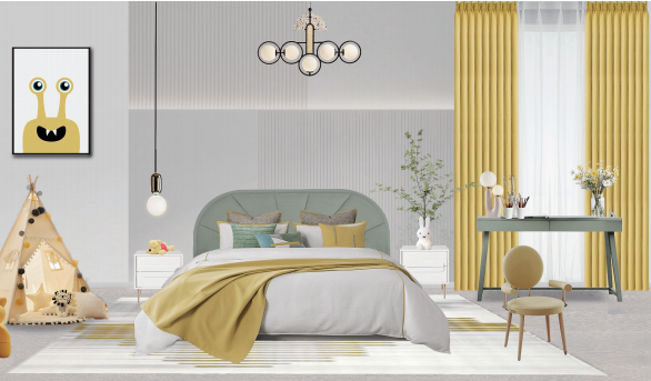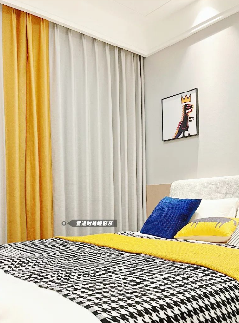 黄色给人温暖、张扬的感觉,充满朝气的色彩非常适合儿童房。比起高明度的亮黄色,这款爱漫时睡眠窗帘使用的玉米黄更为温和,美式、田园、中式都选择较多。配上活泼可爱的装饰画,整体的家居空间比较有亲和感和阳光感,晚上拉窗帘会觉得很温馨,有助于孩子睡眠。