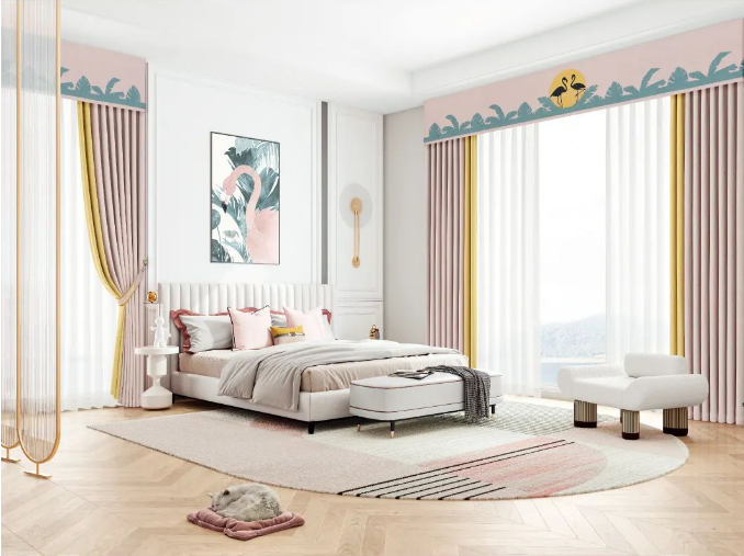 轻松宁静的淡山茱萸粉作为窗帘的主布,充满了青春活力;雾霾蓝更是增添了一笔清新与安静,无论白天还是晚上拉上窗帘,孩子睡眠都非常棒;整个色调明媚梦幻,房间弥漫着甜蜜温馨的气息,圆了女孩的公主梦。