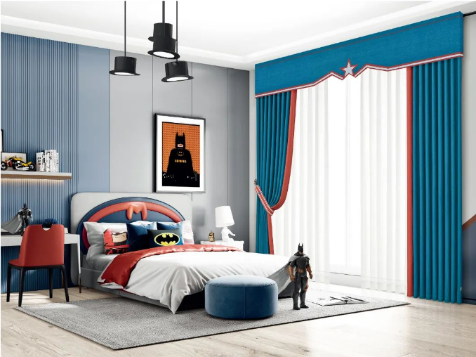 男孩房:鲜活生动的蓝、红拼色窗帘