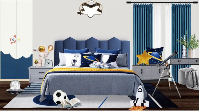 以蓝为主、以红为辅的绝佳撞色,是孩子们热爱的美国队长配色,构建了鲜活生动的生活剧舞台,在这里,孩子们自由与理想的梦尽情徜徉;靓丽的景泰蓝,透彻干净与瑰丽鲜活之感在此并存,对比强烈的撞色很有英伦感。此外,蓝色给人沉静之感,有助于睡眠,即使是晚上不拉窗帘的孩子,看到这样的色彩也会开心地拉上。