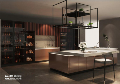 如果你是一位感性的人,那么浪漫的科勒厨房玫珞系列一定不要错过。酒红木纹色配玫瑰金,加上茶色玻璃的映衬,让这款科勒厨房玫珞系列显得分外有情调。时尚简约的吊顶设计,支架底部还嵌入了科勒Veil lighting,能根据心情喜好调节不同色温和亮度,错落有致的空间布局,绿意清新的盆栽摆放,显示出设计美学和生活情调的完美融合。