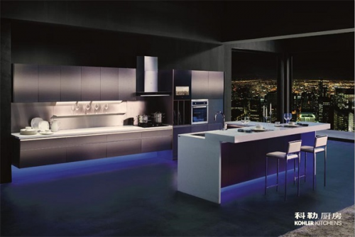 如果你是一个梦幻型的人,科勒厨房整体橱柜皓玥系列将是一个不错的选择。充满科技感的钛金属色表面结合利落线条充满未来感,柔和的蓝色灯光,投射在独特的悬挂式柜体上,宛如悬浮于深邃的星空,增添了几分优雅而柔和。特别设计的音乐柜让你在烹饪美食时也能享受音乐的熏陶。