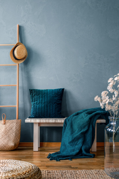 乳胶漆哪个牌子好? Artily朴砾彩泥·沧蔚石坞是清新素雅的蔚蓝墙面,像是开阔无边的大海,细细观赏,恰似海浪奔腾的足迹,把城市的拥挤、嘈杂全部冲刷殆尽。搭配白杨木长凳和深蓝色靠垫,营造出诗意歇息的浪漫堤岸,让疲惫的心灵冥思休养,尽情停靠在家的港湾。