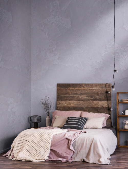 乳胶漆哪个牌子好? Artily朴砾彩泥·蝉鸣木槿纯粹是拙朴的侘寂风墙面,似山、似水的纹路,仿佛是时光留下的自然印记,演绎出四季轮换的动人画卷。搭配原木色床具、简艺风床饰,如同木槿花的朝开暮落,每一天都是更绚烂的开始。