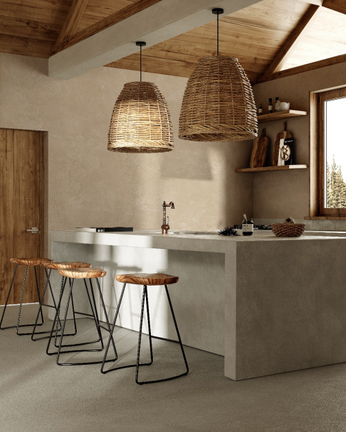 乳胶漆哪个牌子好? Artily朴砾彩泥·裸心空谷具有天然茶色的墙面肌理,当金色阳光投出丝丝缕缕的柔和痕迹,宛若置身于幽静山谷中,惬意舒适。搭配古朴的藤编灯饰、原木屋顶门窗,与灰色清水泥吧台相映成趣,刻画出一副万籁寂静的隐世图。