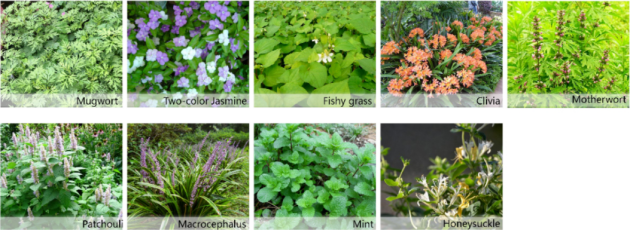 药用植物品种:双色茉莉、麦冬、薄荷、君子兰、藿香、金银花、益母草、射干、鱼腥草、鸢尾等。
